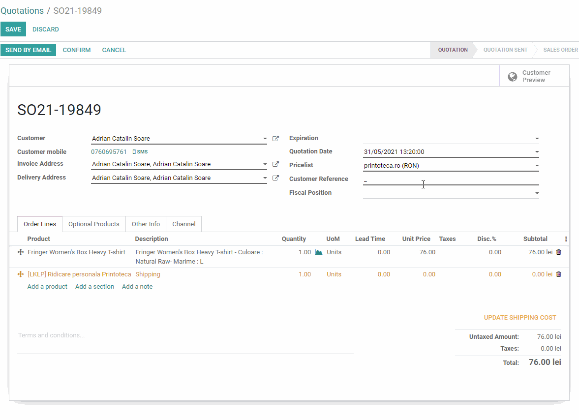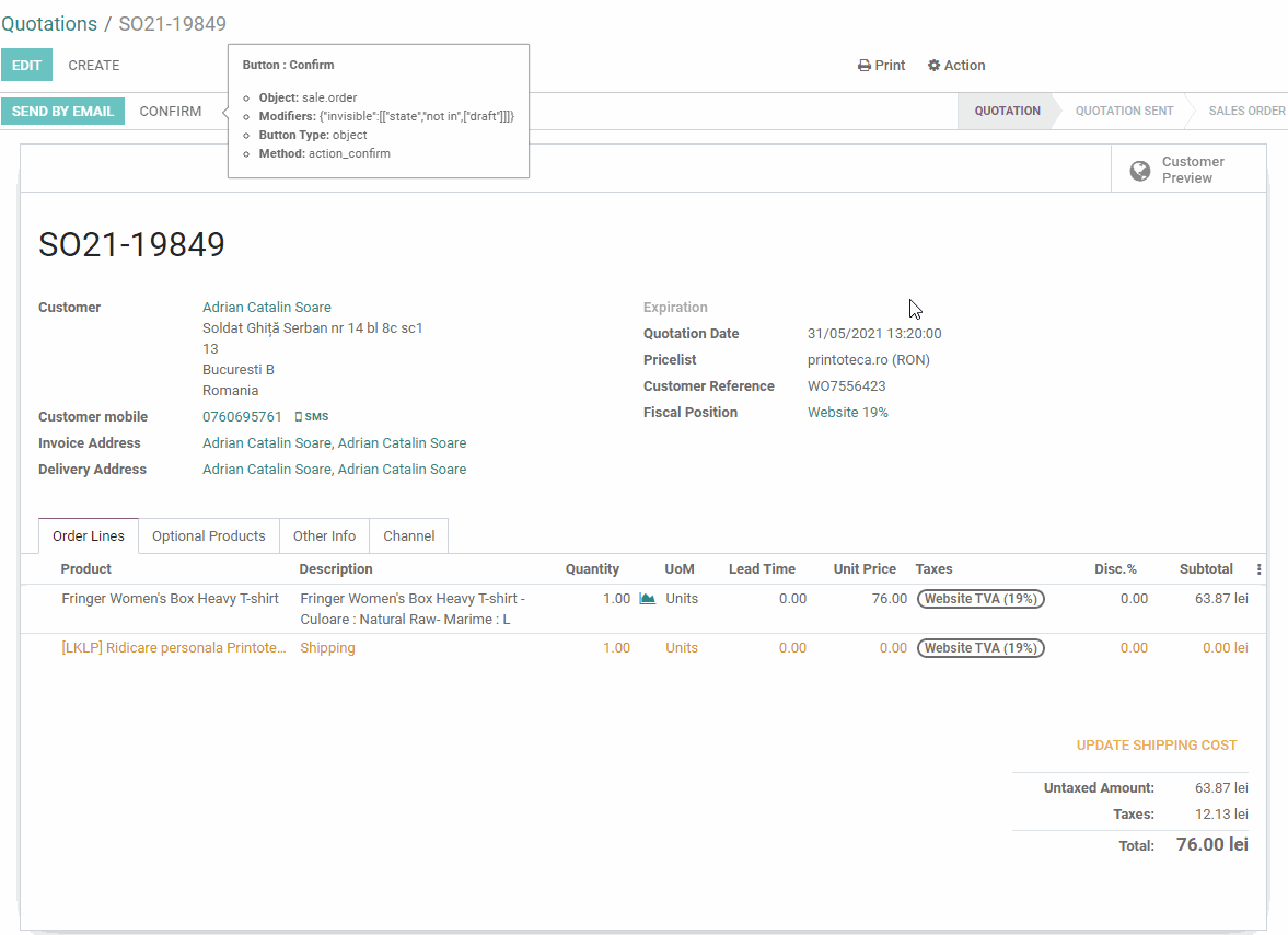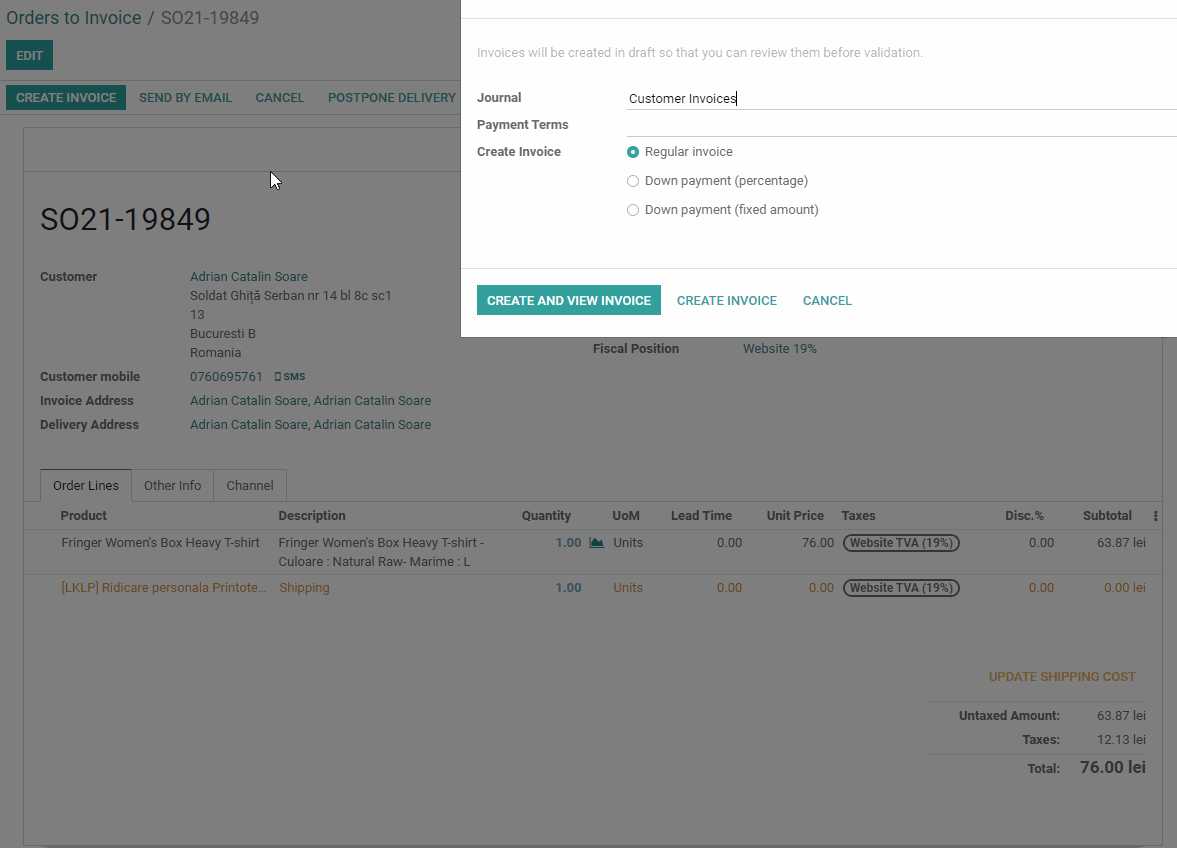 Se seteaza Fiscal Position pe "Website 19%" pentru a calcula TVA-ul de pe comanda